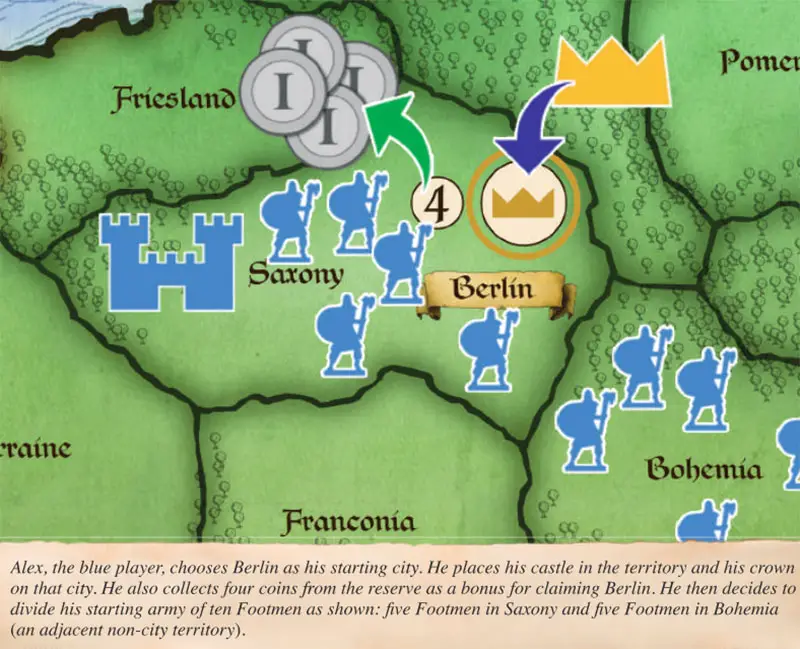 Finally, place ten Footmen, divided in any way you like, between your starting city territory and one adjacent non-city territory.