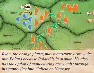 Note: Players may manoeuvre all their army units out of a non-city territory if they choose to do so, but they must leave behind one army unit when leaving city and castle territories.
