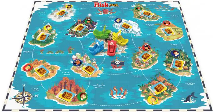 The youngest player starts and places one of the pirate tokens on the island of choice.