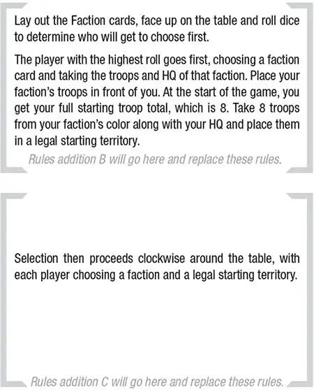 Before you start your first game you will customize your world and your factions. There's no right or wrong way to do this. You can think it through or do it randomly. One person can do it or it can be a group decision.