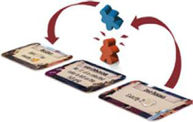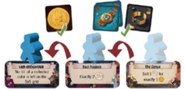Example: The blue player is standing on "The Fence". To move to the "Two Houses" he must have exactly 2 collections. The 2 blue Loot tiles and the single black Loot tile are sufficient.