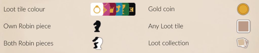 The player's Robin has to stay within the 5x5 Loot tile grid while moving. The Robin may never leave the grid. The player's Robin may never end its turn on the a tile occupied by the other player's Robin.