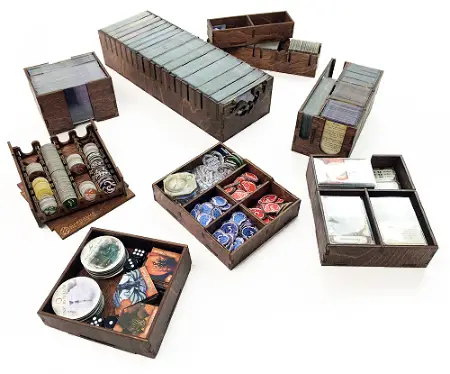 Separate the Aventure cards by their backs. Shuffle each set and place them face down next to the appropriate Action fields on the main board. Shuffle the Beast cards and place them face down near the main board, creating the Beast deck (note that this deck is not the same as the Hunting deck that is created from Beast cards during the course of game). Shuffle the Mystery cards and place them face down near the main board, creating the Mystery deck.