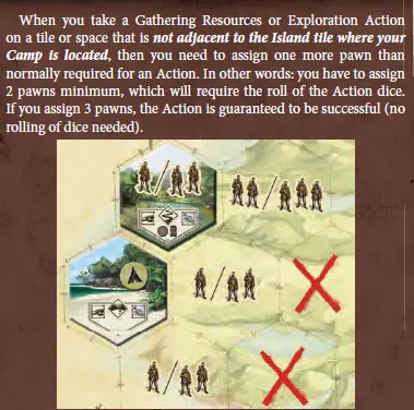 Gathering Resources can only be performed on Island tiles that are either a adjacent to the Island tile where the players' Camp is located, or b one tile away from the Island tile where the players' Camp is located (see below). This Action cannot be taken directly on the Island tile with the players' Camp since players get resources from that tile during the Production phase.