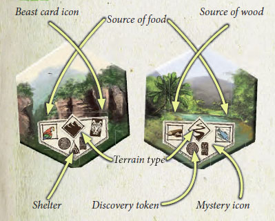 Example: The player draws an Island tile and places it on the selected space of the Island. The terrain type of the tile is Plains, which is the first tile of this terrain type to be discovered this game, so the player marks the Invention cards "Basket", "Cure", and "Rope" (these Inventions can now be built into Items). A beast card icon is shown on the tile, so the player shuffles one Beast card into the Hunting deck. Finally, he draws 2 Discovery tokens (as depicted on the tile), and puts them face-up in the Future Resources space.