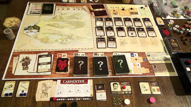 When there are 4 players, take the special "Arranging the Camp" card and place it on the board covering the corresponding space. When there are only 2 players, they have an additional Character - Friday. Take the Friday card as well as the white pawn, and place them within easy reach of the players, near the board. Take a Wound marker and put it on the leftmost space of Friday's life track.