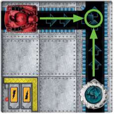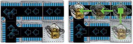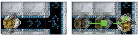 Conveyor belts move your robot in the direction of the arrows. Double-arrowed conveyor belts move robots two spaces and activate before single-arrowed conveyor belts, which move robots one space. Once a robot has moved off a belt, the belt no longer affects that robot. See the examples below.