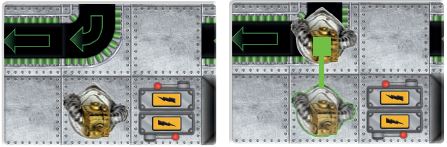 Remember, if a conveyor belt would move a robot into a non-conveyor-belt space where another robot sits, the robot in motion must stop on the last space of the conveyor belt. It does not push the robot in its way.
