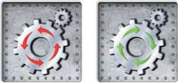 Gears rotate robots resting on them 90 degrees in the direction of the arrows. Red gears rotate left, and green gears rotate right.