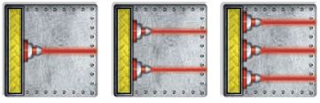 Board lasers fire at robots who end a register in their path, starting at the red and white pointer. Lasers cannot fire through walls, the priority antenna, or hit more than one robot.