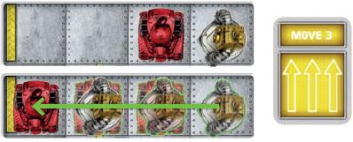 Here Hulk x90, Hammer Bot, and Smash Bot are sitting in a row. Smash Bot moves one space and pushes the other two robots one space.