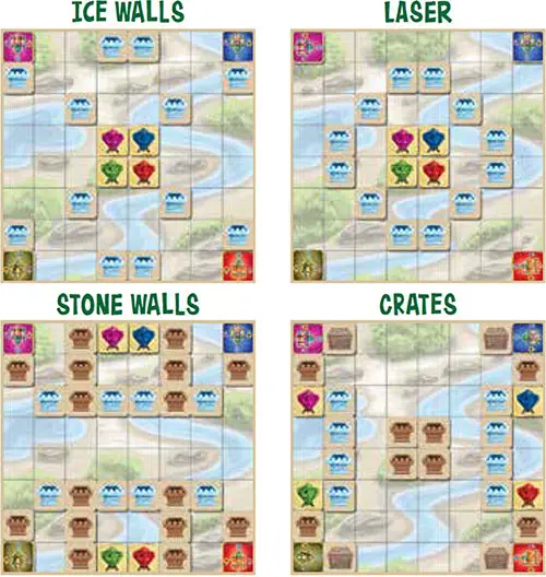 Place Obstacle Tiles on the board before the game begins. Place them however you like as long as they don't trap a Turtle or a Jewel before the game has started.