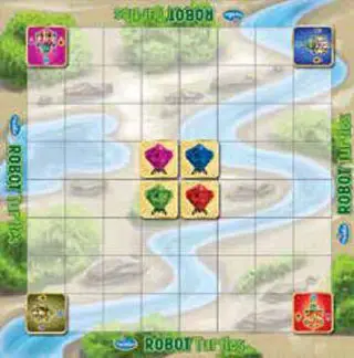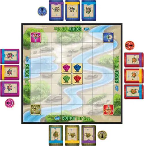 For each Turtle Master playing, place the matching Jewel Tile in the center of the board and the Robot Turtle Tile in its respective corner.
