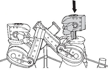 Slide the controllers into the slots on the side of the ring. Controllers should be inserted at an angle with the knob on the end of the controller going through the opening first.