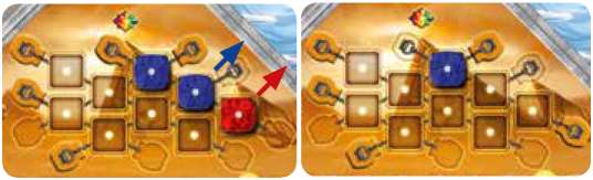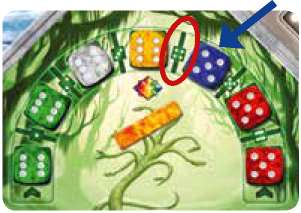 Following the placement of a die, if there is now a continuous line of two or three dice, you must decide whether you want to receive the corresponding reward and withdraw the dice.