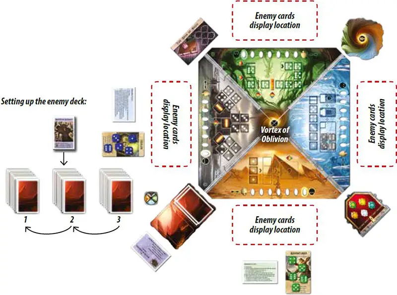 Important: If a player has no dice at the beginning of his or her turn because the dice have been placed or have been lost to the Vortex of Oblivion, the player still has to reveal the topmost card of the enemy deck.