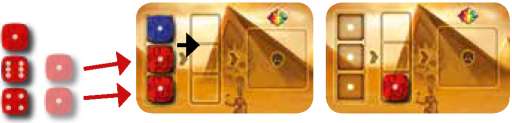 Example: Player Red has rolled her five dice. She places two dice with a value of one on spaces in the first section. Since there is already one die from /player Blue here, the subtask is fulfilled.