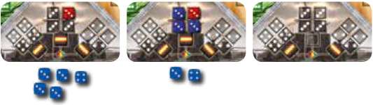 Example: Player Blue has rolled four 3's and one 4. Since there is already one red die on the fortress section showing a three, player Blue adds three of his 3's to it.