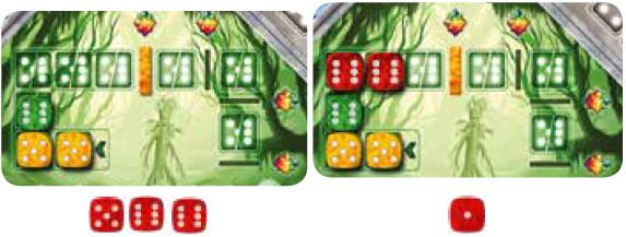 Example: Player Red still has three dice on her hero board. She rolls them and gets two 6's and a 5. Since there are already three dice on the forest path, there are only three more dice needed.