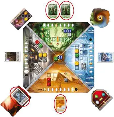 If an attack results in dice having to be removed from a territory, then these dice are placed in the middle of the game board, on the Vortex of Oblivion. These dice are no longer available to the players and can only be freed again later with the help of the Vortex of Resurrection or by specific heroes.