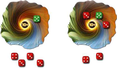 If the total value of ten or higher is reached on the Vortex of Resurrection, then all dice are immediately freed from the Vortex of Oblivion in the middle of the game board. Their owners receive their dice back, as well as the dice which were placed on the Vortex of Resurrection.