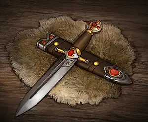 Jeweled Dagger / Longsword: When a player scores their Attribute Goals with these weapons, dice can be valued as greater than 6. These Weapon cards have no effect when determining if a player has met requirements on a Trait card like Reckless or Weak. Example: If a player has the Jeweled Dagger and has a Blue 5, a Gold 6 and a Gold 5 in Strength, their Attribute Score is 18 = 5 + 6 (+1) + 5 (+1) when scoring their Attribute Goals.