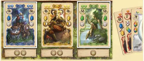 Each player takes a player board, an overview card, one set of druid cards, and a scoring marker of their chosen color and symbol. Additionally, give one gem of each color plus one wild gem to each player.