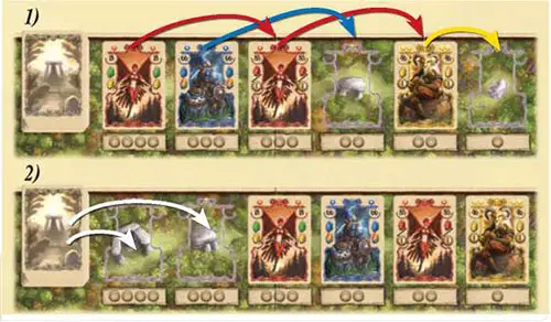 Finally, replenish the display. Move all remaining cards to the right, leaving no empty spaces. Place one card from the draw pile on each empty space on the left of the display.