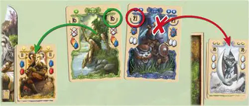 Example: The blue creature card (21) has the higher number and is therefore placed in the general discard pile. The green card (16) with the lower number is placed in the player's discard pile.