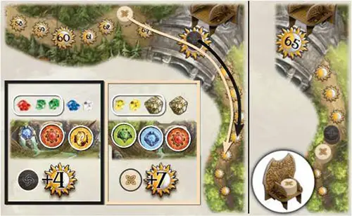 Example: The black player gains 4 power points, 3 from his artifacts and 1 from his leftover gems. The beige player gains 7 power points, 6 from his artifacts and 1 from his leftover gems and ores. Therefore the beige player is the leader at the end and is the winner of the game.