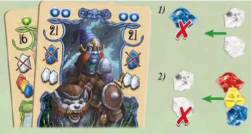Example: The player utilizes the ability of the blue card first and discards a blue gem to get 2 wild gems from the supply. She then uses one of these wild gems to activate the second (green) card, discarding it to receive 3 gems (a red, yellow, and blue) from the supply.