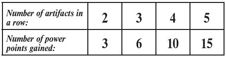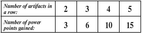 The player may decide for each of their two rows of power containing at least 2 artifacts if they want to discard all artifacts from that row in order to gain power points and one rune stone from the display, or to keep them for later use. If they decide to discard the artifacts, they gain power points as follows: