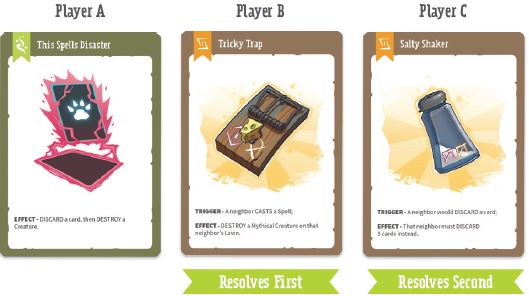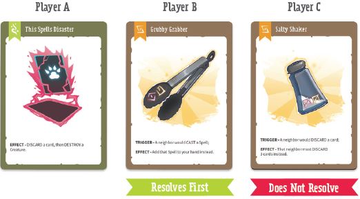 Example: Player A plays This Spells Disaster. Player B wants to ACTIVATE Grubby Grabber and Player C wants to ACTIVATE Salty Shaker.