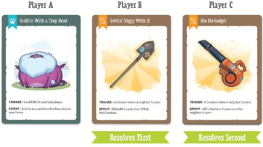 Example: Player A plays Griffin with a Tiny Head. Player B wants to ACTIVATE Gettin' Diggy With It and Player C wants to ACTIVATE Bio Bio Gadget.