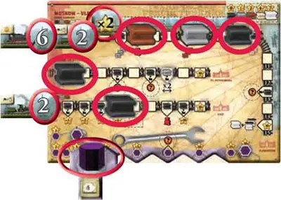 Example: Red has a #2 locomotive on the Kiev railroad. Red will thus only score spaces 1 and 2.