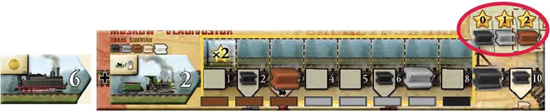 Example: Red has a #6 and a #2 locomotive on the Trans-siberian. Her locomotives allow her to reach space 8. Thus, Red will only score spaces 1 through 8.