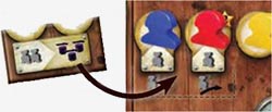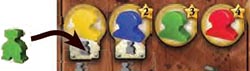 Once every player has passed, the players who placed a worker under the turn order track remove their pawn. To free the turn order spaces, the other pawns are moved to the right (towards the last spaces of the turn order track). Then, the players place their pawn on the turn order space above their worker.