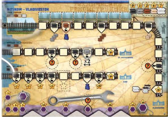Important note for this railroad: when a player reaches space 7 of this railroad with his gray rail and a locomotive, the value of all scored spaces on his St.Petersburg railroad are doubled.