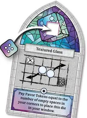 As an action, a player may pay Favor Tokens to use a Rare Glass Board, taking a Rare Glass Die from it to place in their window. Unless otherwise indicated, this may be done at any time during their turn.