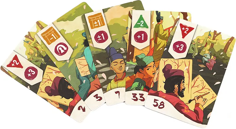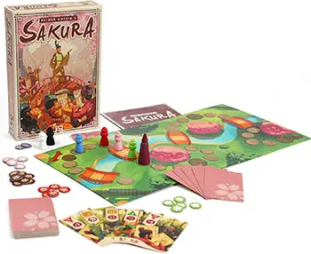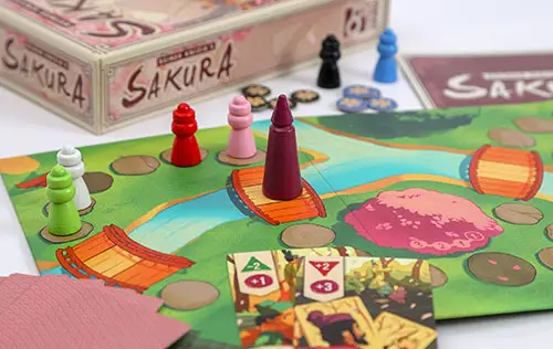 The game ends immediately after scoring the last sakura space. The player with the most tokens wins. If there is a tie, the tied player closest to the Emperor wins.