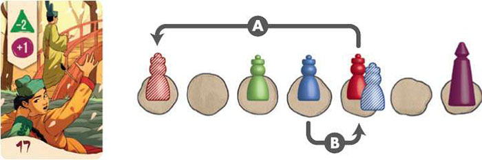 The blue player has the lowest order number, so resolves their card first. The red player is closest to the Emperor, so moves back two spaces, skipping over occupied Aces A. Then the blue player moves forwards one space B.
