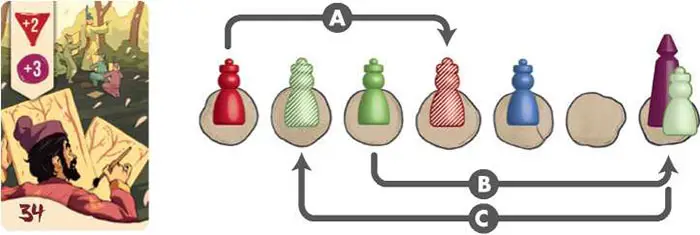 The green player is next in order. The red player is now last, so moves forwards two spaces A, then green tries to move forwards three spaces B, but they bump into the Emperor! The green player immediately moves back three spaces C and loses a token.