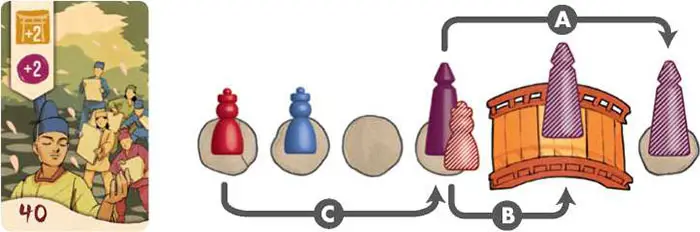 The red player's garden action moves the Emperor forwards two spaces. Because there are only three players in the game, the bridge only counts as one space, and the Emperor crosses the bridge in a single move A.