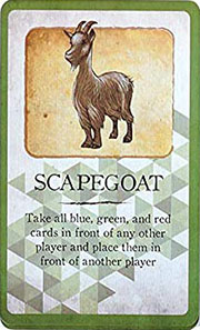Therefore, when only two players remain Scapegoat and Robbery may not be played and should be treated like Blue Cards.