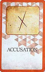 RED cards remain in front of a player until that player has 7 total accusations. The person playing the 7th accusation chooses a Tryal card to reveal in front of the player receiving the accusations. All Red cards in front of that player are then discarded.