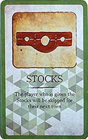 When played, the Stocks card should remain in front of the player until they have been skipped. It should then be discarded.