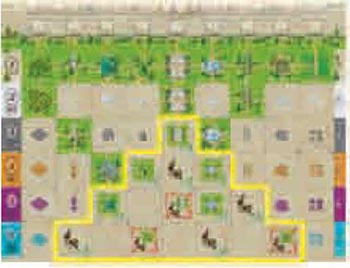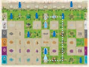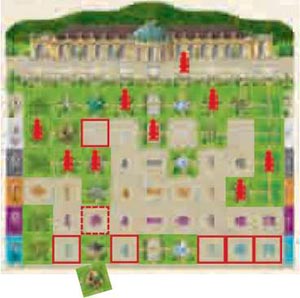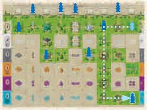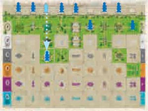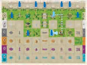 Julian moves his nobleman from the terrace to the pavilion in the grey row: he receives 3 points. He can never move his nobleman back to either the white or beige row; he can move the nobleman over these squares again, as long as the nobleman doesn't stop there.
