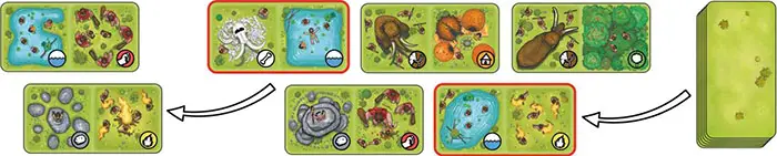 Going clockwise, each other Player puts her first tile into play, scores her first Shelter Points, and refills the Pools.