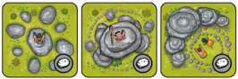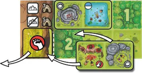 The first player chooses a tile in his Personal Pool and lays it face-up on any Cave on his Valley board. The icon on the Scene that he places on this Cave square must match the icon on the Mountain token that lies there.