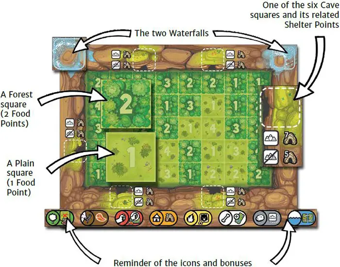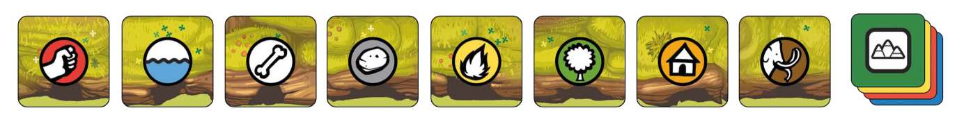 Next, each player chooses a color. Take the eight Mountain tokens of your color and put them randomly on the eight squares on the edges of your board : the six Cave squares and the two Waterfalls 7, with the Scene icons visible. Draw four Tribe tiles from the Stack, and place them face-up next to your board. These form your Personal Pool 8.
